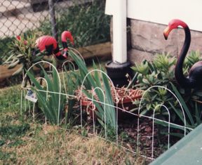 Added some irises out back next to the house and a couple little rhododendroms. See there were more partially pink flamingos, too. |
