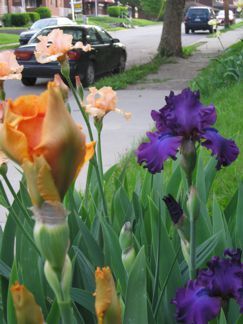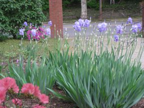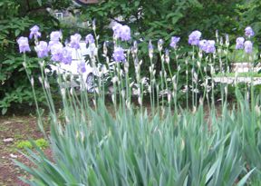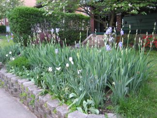 Same heirloom irises as previous house were planted here and there are viburnum as a border. |