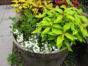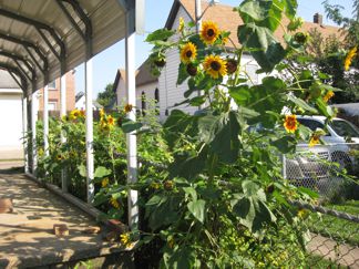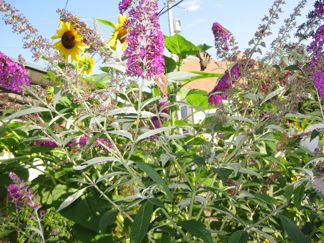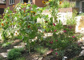 | Added sunflowers which the squirrels and chipmunks have completely decimated. There is a butterfly bush and other perennials around and under those sunflowers. |