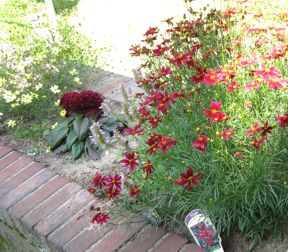 | Removed yews in back raised bed, then added tickseed. The bees like tickseed. |