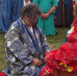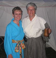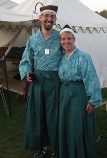 I started by making european tunics using a pattern that I modified to change the neck or add grommet and ties to lace the front V. Then I made skirts without a pattern. The skirts were either simple casing skirt, or had a waist band, and a slit with grommets and ties to lace up at the waist. If I wanted something nicer or fitted, I would get a pattern for that. I made capes and a doublet using McCalls or Simplicity patters. Then when I started sewing Japanese, I started with Folkwear patterns. The problem was that the garments didn't look right, according to our friends. Some parts were too modern and others were not correctly proportioned for medieval Japanese clothing. Both my husband and I were sewing Japanese clothing, so we were both learning. We just started winging it or using directions that friends had written. As time has gone on, we found more information about the detailed construction, the proportion of the parts of the article and period fabric. We also learned about shibori dyeing techniques.