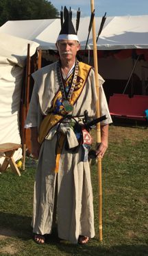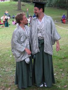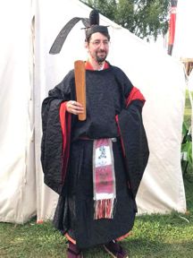 These outfits were more extensive work and were made for a specific reason. Their majesties wanted Japanese garb for court, and we make the outfits to show first at academy, then at SCA 50 year, and then again at Pennsic for court at Yama Kaminari camp. Note that the outfits are more warrior class, than formal imperial court style. Ishiyama's Bunkan Sokutai is formal court wear and appropriate for his elevation to the Order of the Laurel. His white under garments, the sashinuki pants, the footwear, kanmuri, and accessories were items that he had already or constructed/obtained for the occasion.