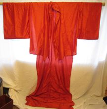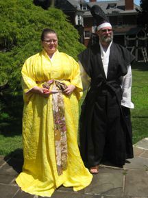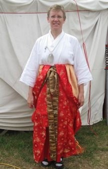 The long orange piece with the tail is a shitagasane the color must adhere to sumpturary regulations. | Our friends the Baron and Baroness of our local barony, would be on the dais and she was speaking on Ishiyama's behalf, so we make them outfits. I make hers. I dyed the kosode, and the obi was fabric from the kosode that I made myself for the occasion. | ![]() |