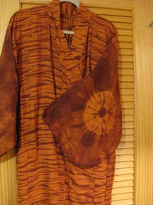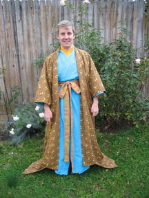 As Baronial Champion, I had to compete in the seven pearls competion against the other baronial champions in our kingdom. (Gulp). I constructed a dobuku that was more correct in proportions. | It was also dyed with shibori resist patterns on the sleeves and at the shoulders and hem. The lining was also dyed that golden color that I tried earlier. This dobuku was a present for the clan dono. | ![]() |