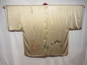 There is often a cloak for elevation. I made a lined dobuku, but the painting was done by Isabel. | Notice the bunnies for honeybunny, and the laurel wreathes around the sleeve edge. | ![]() |